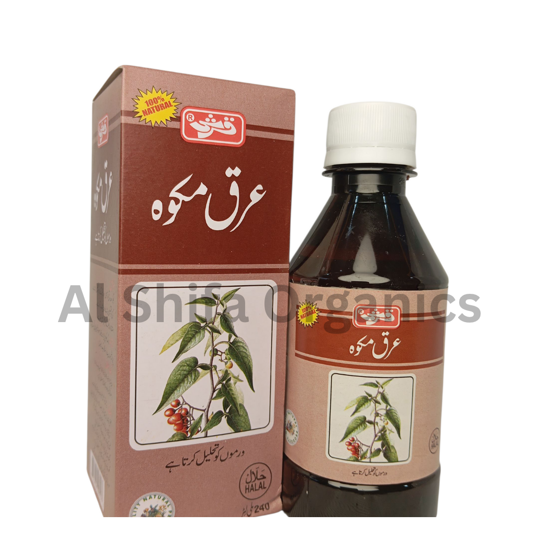 Arq-e-Makoht is a classical Unani herbal distillate prepared from the plant Mako (Solanum nigrum). It is widely used for its soothing effect on the liver, stomach, and digestive system. Traditionally, it helps reduce inflammation, supports liver function, and promotes natural detoxification.